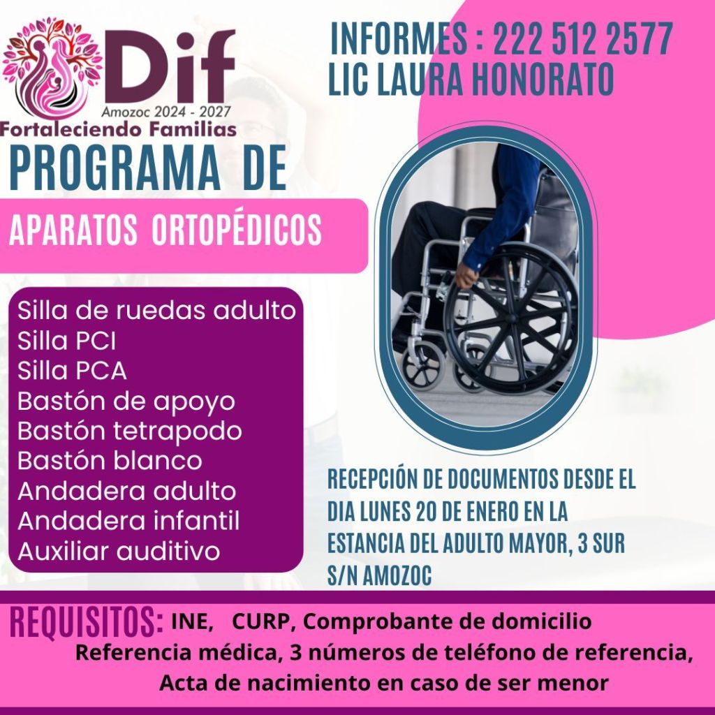 El Sistema DIF Estatal y Municipal de Amozoc a cargo de la presidenta Gloria Barrales Mendoza informa a la ciudadanía que requiera aparatos ortopédicos que ya pueden inscribirse en su programa de apoyo.