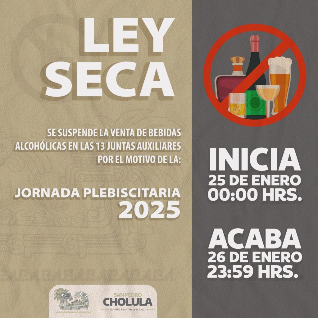 Las y los integrantes de Cabildo de San Pedro Cholula, junto con la presidenta municipal, Tonantzin Fernández, aprobaron la puesta en marcha de la «Ley Seca» en las 13 juntas auxiliares, con motivo de los plebiscitos, los cuales se realizarán el 26 de enero.