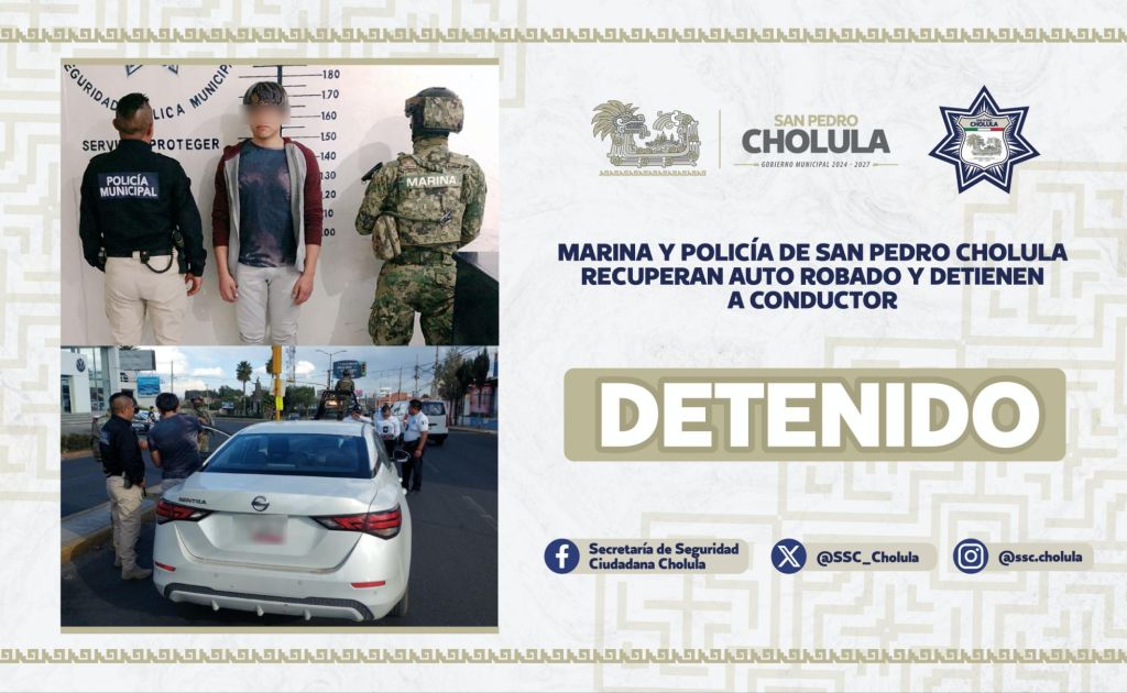 Como resultado de una pronta intervención y de estrategias de reacción, elementos de la Secretaría de Marina (SEMAR) y de Seguridad Ciudadana de San Pedro Cholula (SSC Cholula), recuperaron un vehículo con reporte de robo y detuvieron a José Antonio “N” de 23 años de edad.