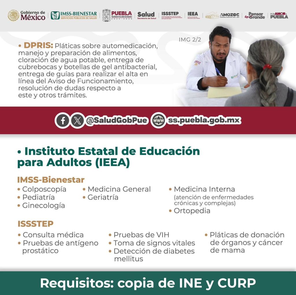 Durante esta actividad, las y los ciudadanos podrán acceder a servicios médicos completamente gratuitos brindados por la Secretaría de Salud, el IMSS-Bienestar, el ISSSTEP y el Instituto Estatal de Educación para Adultos (IEEA).