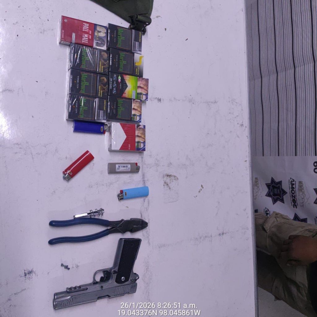 Durante la intervención, realizada conforme al protocolo de actuación del primer respondiente, al individuo se le localizaron diversos artículos presuntamente relacionados con el robo, así como un objeto con características similares a un arma de fuego.