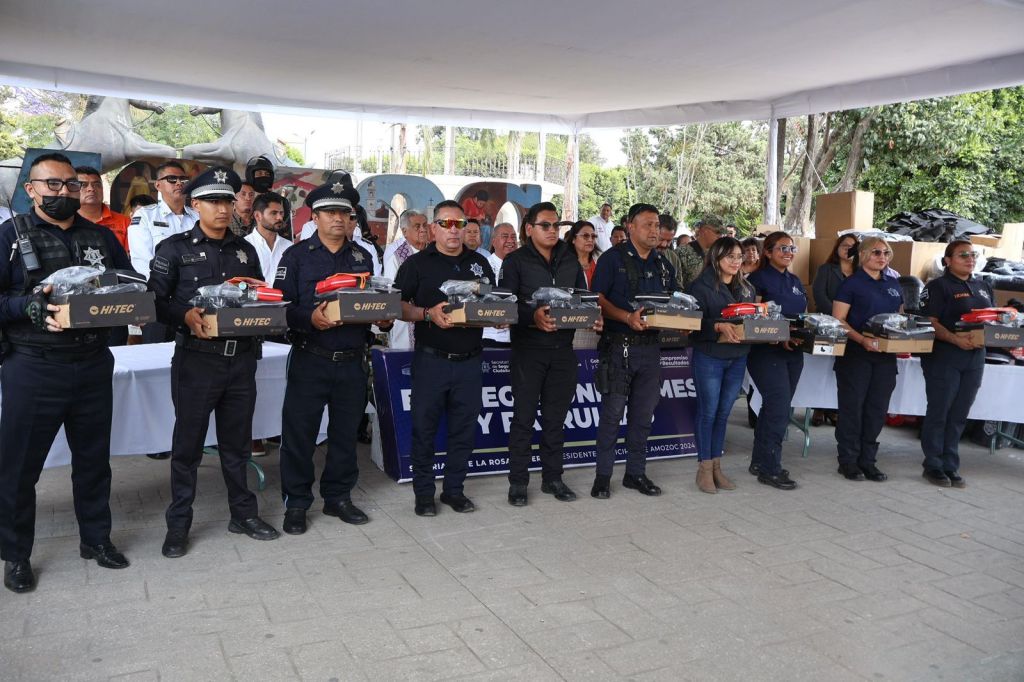 Durante el evento, se destacó el esfuerzo y compromiso de los elementos policiacos, quienes fueron reconocidos en coordinación con la empresa Oxxo. Asimismo, se realizó la entrega de uniformes, equipo táctico y unidades, además del banderazo del Operativo Semana Santa.